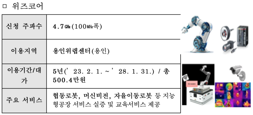 위즈코어는 이음5세대(5G) 주파수를 할당받아 용인 위랩센터에서 지능형공장 솔루션으로 적용될 협동로봇, 머신비전, 자율이동로봇(AMR) 등의 시험장을 구축하고 교육생들에게 지능형 공장 솔루션 실습 및 체험 교육을 제공할 예정이다.