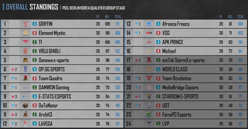 그룹 스테이지 2주 차 경기에서 치열했던 16위 싸움은 단 1포인트 차이로 갈렸다. 그룹 스테이지 1주 차에 22위를 기록한 미카엘(MICHAEL)이 최종 72 킬 94포인트로 16위에 올랐다. 종합성적으로는 그리핀(GRIFFIN)이 누적 109킬 171포인트로 1위에 올랐다. 엘리먼트 미스틱(ElementMystic), 티원(T1), 브이알루 기블리(VRLU GHIBLI), 다나와 이스포츠(Danawa e-sports)가 2~5위를 차지했다.