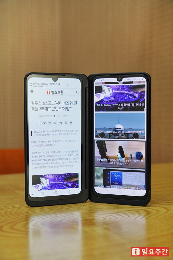 | ▲ LG V50S 씽큐 듀얼스크린 펼친 화면 (사진=지혜수 기자) |