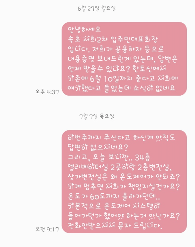 입주자대표회의는 시행사인 한국토지신탁에도 지난 5월 하자보수의 신속한 처리를 요청하는 내용증명을 보냈는데, 이에 대한 답변은 “6월 10일까지 서희건설에서 답변을 주겠다고 했다”라는 내용이었다.