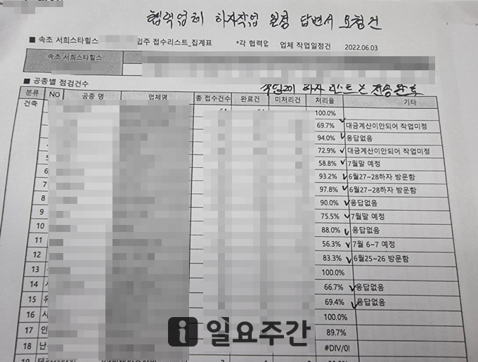 | ▲협력업체 하자작업 일정표로 일부 업체들은 대금계산이 안되어 작업 미정인 상태이다.(자료=입주자대표회의) |