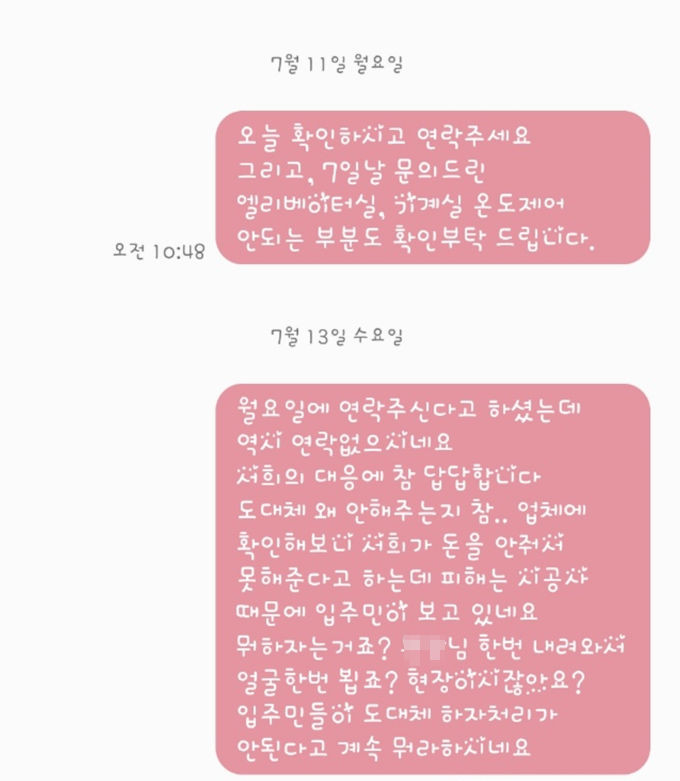 이어 “서희건설 하자보수 담당자는 수십여 통의 전화도 전부 피하고, 수차례의 문자에도 답도 한번 없다”며 본사로 전화를 걸어 QC팀의 책임자를 바꿔달라고 요청했으나 자리에 없다고 해 통화를 요청했지만 연락이 없었다”라고 토로했다.