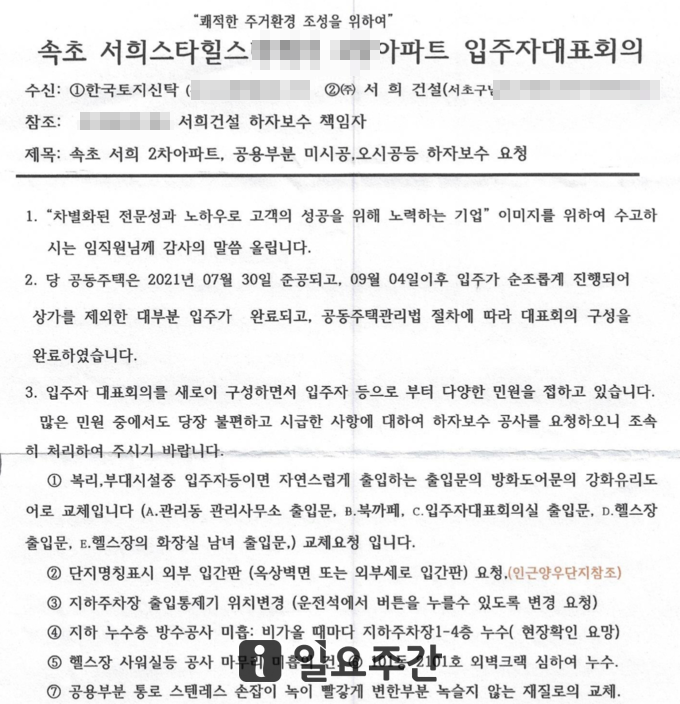 | ▲속초 서희스타힐스 아파트 입주민대표회의에서 한국토지신탁과 서희건설에 하자보수를 요청하는 내용증명.(사진=입주자대표회의) |
