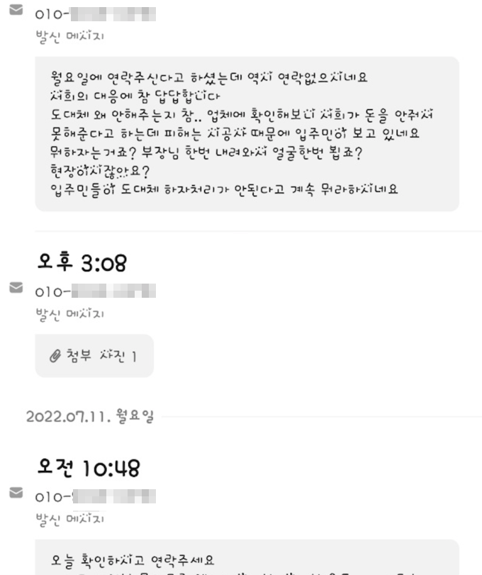 | ▲입주자대표 회장이 서희건설 하자보수 담당자에게 발송한 문자메시지. |