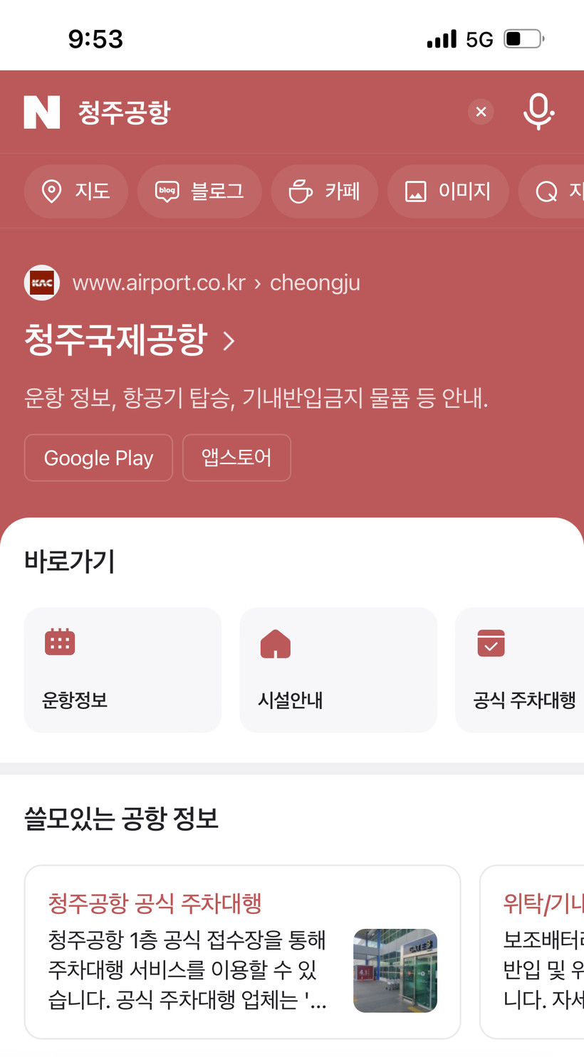 | ▲ 네이버 검색창에 청주공항을 검색하면 '쓸모있는 공항 정보'로 접근(이미지=한국공항공사) |