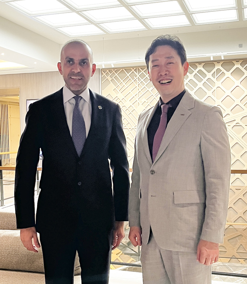 | ▲ 윤형중 한국공항공사 사장(오른쪽)이 아이만 알 호스니 오만공항 CEO(왼쪽)와 Airports Innovate 협력방안을 논의하고 기념촬영을 하고 있다.(사진=한국공항공사) |