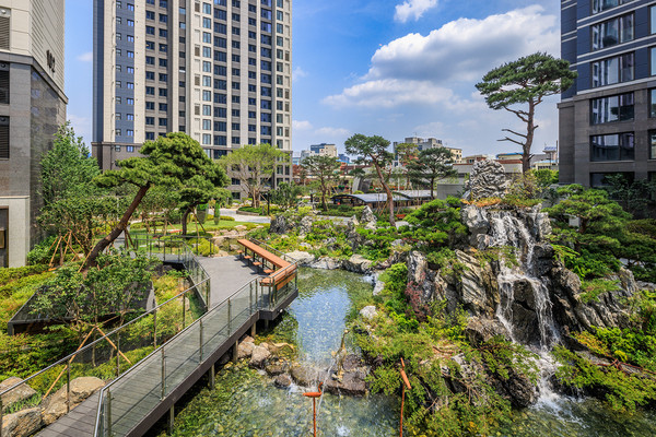 이번에 미술작품을 설치한 단지는 서울시 광진구 자양동에 위치한 ‘롯데캐슬 리버파크 시그니처’다. 단지에 들어서면 커다란 소나무와 웅장한 바위, 이끼를 감상할 수 있는 ‘이끼원’이 조성돼 있다. 단지 중앙에 자리 잡은 수경시설에는 석가산과 폭포를 설치해 자연의 청량함을 느낄 수 있는 풍경을 자아냈다.