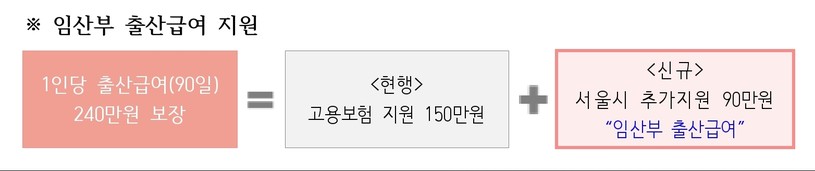 우선, 서울 거주 1인 자영업자‧프리랜서 임산부는 출산시 「고용보험법」 상 법적 하한액인 240만 원을 보장받는다. 기존 고용노동부의 ‘고용보험 미적용자 출산급여’ 150만 원에 서울시가 추가로 90만 원을 지원한다.