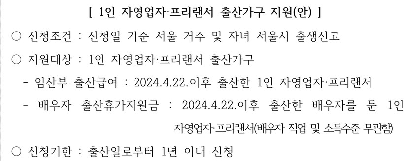 서울시는 카페, 네일샵, 미용실 등을 홀로 운영하는 1인 자영업자와 프리랜서는 직장인과 달리 출산이 생계 활동의 중단으로 이어질 수 있는 만큼, 이들에 대한 지원이 반드시 필요하다고 취지를 설명했다. 1인 자영업자와 프리랜서 출산가구가 조금이라도 마음 편히 임신‧출산과 생업을 병행할 수 있도록 최소한의 안전망을 마련한다는 계획이다.