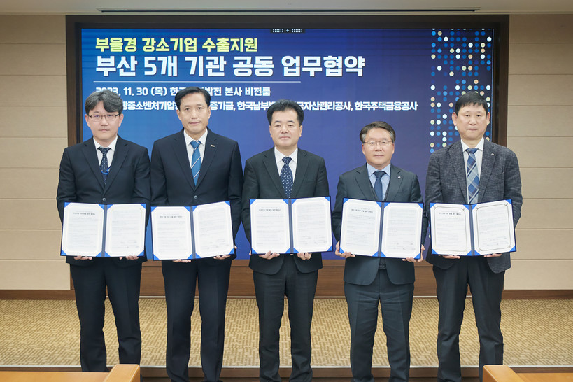 | ▲ 한국주택금융공사는 부산 남구 소재 부산국제금융센터 한국남부발전 본사에서 부산지역 4개 공공기관과 수출 강소기업의 해외 수출 지원을 위한 업무협약을 30일 체결했다. (사진 왼쪽부터) 원호준 한국자산관리공사 이사, 박주선 기술보증기금 이사, 김일호 부산지방중소벤처기업청장, 이승우 한국남부발전 사장, 이규진 한국주택금융공사 이사가 기념촬영을 하고 있다. (사진=HF) |