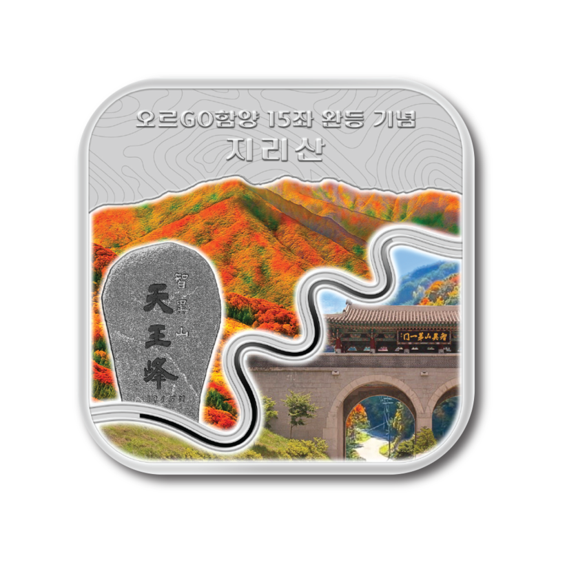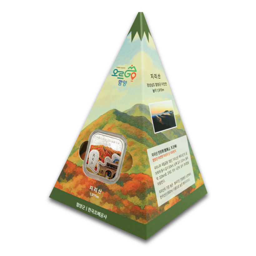 이번에 공개된 첫 번째 메달은 산을 시리즈 주제로 선정해 지리산을 표현했다. 앞면에는 단풍이 물든 지리산의 장엄한 풍경과 천왕봉 정상석, 함양에서 지리산을 오르며 만나게 되는 지리산 제일문을 담아냈다. 특히 구불구불한 길이 멋들어진 지안재 부분은 프루프급 메달(특수 제조공정과 엄격한 품질 검사를 통해 제조한 수집가용 무결점 메달)에 적용되는 유광처리를 적용해 입체감을 살렸다. 뒷면에는 한국조폐공사의 특허기술인 4방향 잠상을 적용했으며, 15개 시리즈 중 상징적인 천왕봉 정상석을 유광으로 새겼다.