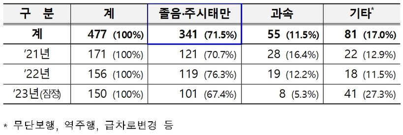특히, 설 연휴 기간에는 장거리 운전으로 인한 피로 누적, 집중력 저하로 졸음운전에 주의해야 하며, 실제로 최근 3년간(‘21~‘23년) 설 연휴 교통사고 35건 중 졸음ㆍ주시태만(추정)으로 발생한 사고는 28건으로 80%를 차지했다.