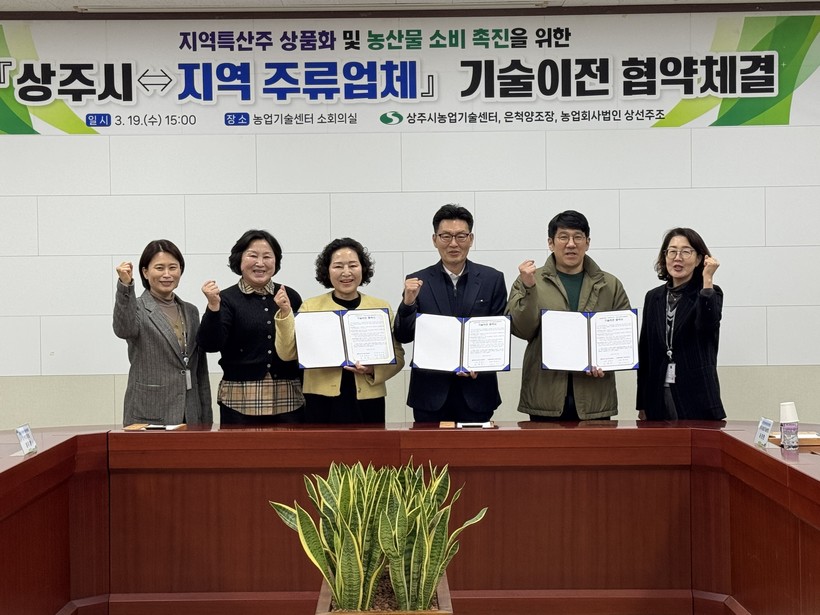 [일요주간=최부건 기자] 상주시농업기술센터(김정수 소장)와 지역 주류업체(은척양조장, 상선주조)는 3월 19일 농업기술센터 소회의실에서 지역특산주 상품화를 위한 기술이전 협약을 체결했다.