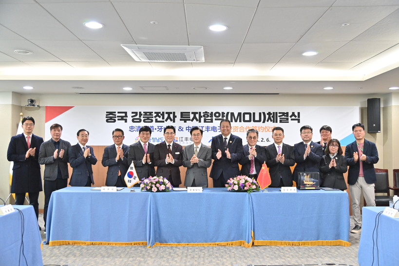 김태흠 지사는 6일 도청 접견실에서 왕쉐쩌 중국 강풍전자 총경리, 박경귀 아산시장과 투자협약(MOU)을 체결했다.
