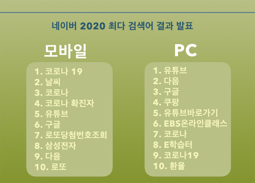 또 네이버 PC에서 최다 검색어는 작년에 이어 '유튜브', '다음', '구글'이 나란히 1, 2, 3위를 차지했다. 모바일과 마찬가지로 코로나바이러스감염증-19 관련 검색어인 '코로나'(7위), '코로나19'(9위), '코로나확진자'(19위) 도 상위를 차지했다.