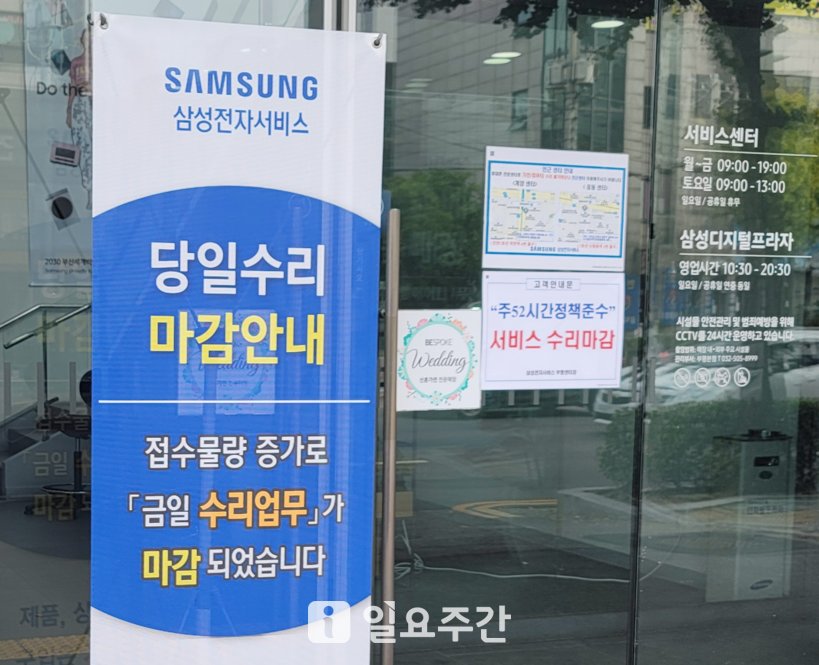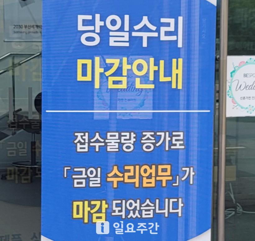 A씨는 <일요주간>과의 전화 통화에서 “현재 2주째 서비스받지 못하고 있다. 토요일 오전 9시에 도착해도 접수 마감 딱지가 붙어있고, 평일에는 1시쯤 방문했는데 입구에 접수 마감이라고 붙어있다”며 “이러한 문제가 생기면 삼성전자에서 인원수를 늘리던지 예약접수나 택배접수를 하던지 해야 하는데 계속해서 서비스를 받지 못하고 있다”고 분통을 터트렸다.