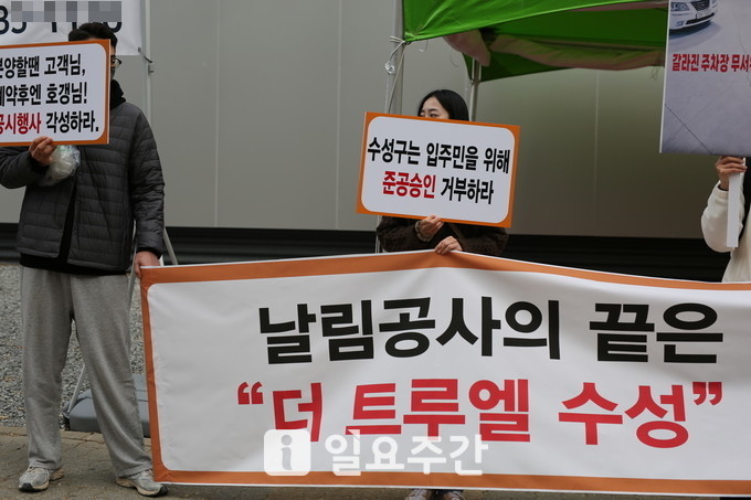 [일요주간 = 김상영 기자] 일성건설이 시공 중인 대구 수성구 소재 신축 아파트(더트루엘)가 12월 준공승인 심사를 앞두고 건물 하자와 내외부 시공 미흡 등으로 날림공사 논란에 휩싸인 가운데 지난달 27~29일 입주예정자들을 상대로 진행된 사전점검이 파행(본지 11월 1일자 보도 : 일성건설 시공 아파트 날림공사 논란 속 사전점검 연기…“문짝도 없고 인분에 경악”)된 바 있다.