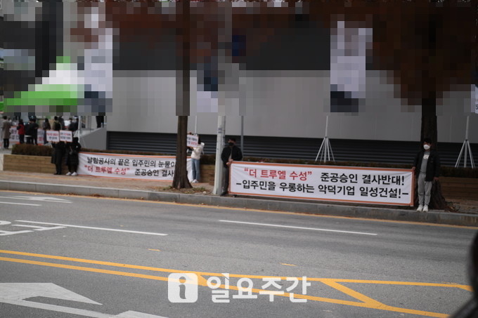 더트루엘 입주예정자들은 일성건설 측에 누수, 건물 내부 벽면 균열 등 하자보수와 외부 도색 변경과 관련해 (12일) 사전점검 전에 이행 확약을 요구했으나 약속이 지켜지지 않았다고 강력 반발하며 20일 일성건설이 천안에서 분양 중인 더트루엘 모델하우스 앞에서 준공승인 반대를 촉구하는 집회를 열었다.