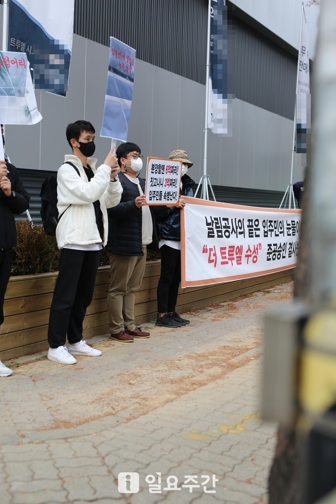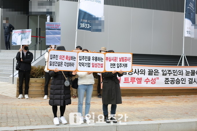 당시 더트루엘 아파트 현장을 둘러본 입주예정자들은 이 같은 이유로 사전점검 연기를 건설사와 관할 구청에 요청했고 결국 11월 12일에 다시 사전점검을 진행하기로 합의했다.