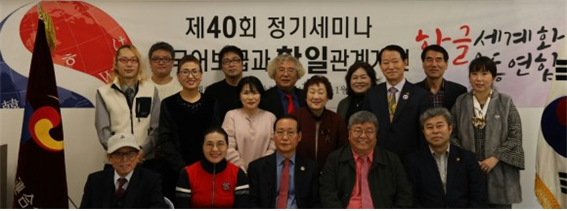 ◀ 오양심 이사장 / 지난 1월 29일, 일본 도쿄 신주쿠에 위치한 재일본한국인연합회 회의실에서, 한국어보급과 한일관계 개선에 대한 세미나와 토론회를 가졌습니다. 한국에서는 손석우(해외동포책보내기운동협의회)이사장, 백남식(사진작가, 홍보)이사, 신락균(목사, 해외선교교육)본부장, 이문숙(목사, 해외선교교육)부본부장, 김총회(세종본부)본부장, 황지희(대외협력)위원장, 정태기(언론)본부장, 최치선 사무총장 등이 참석했습니다.