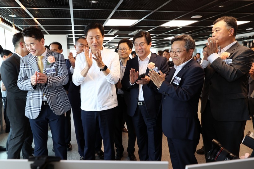 | ▲ 오언석 도봉구청장(왼쪽부터), 오세훈 서울시장, 김선동 국민의힘 위원장, 김헌동 SH공사 사장, 유병태 HUG 사장이 49층 시설을 둘러보고 박수를 치고 있다. (사진=SH공사) |