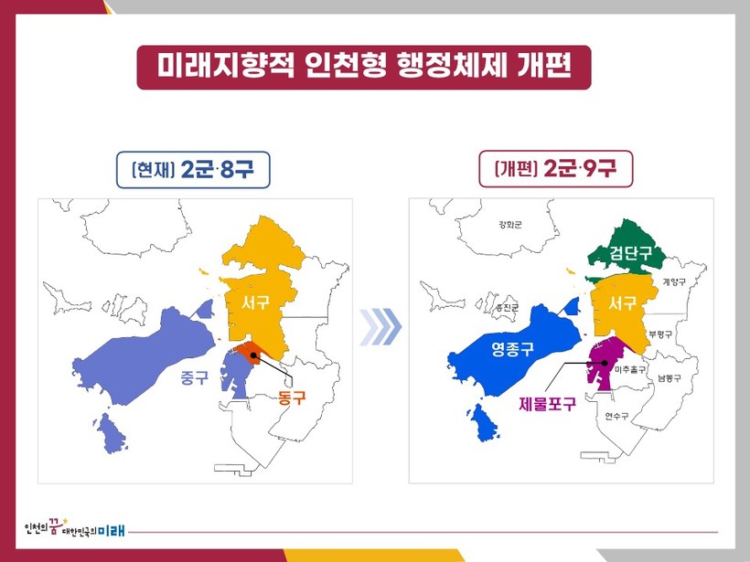 [일요주간=김영란 기자] 2026년 7월부터 현 2군(郡)·8구(區)를 2군·9구로 바꾸는 인천형 행정체제 개편을 내용으로 하는 정부 법률안이 국회를 통과해 공포 절차만 남겨두게 됐다.