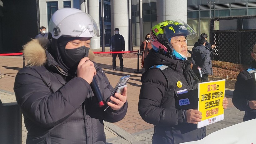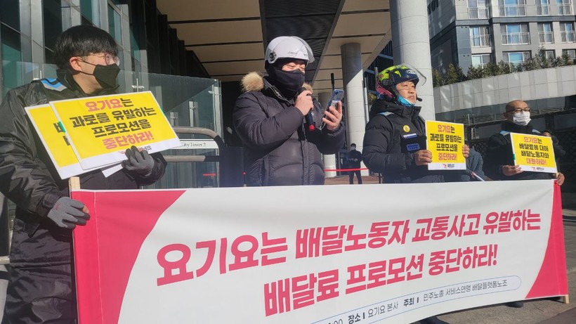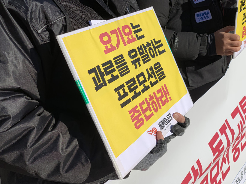노조에 따르면 배달플랫폼 중 배달 주문량이 2번째로 많은 요기요가 지난해 12월 19일부터 배달노동자가 일주일에 70~90시간씩 운전을 하게 만드는 프로모션을 진행하고 있다. 이는 배달노동자의 생명과 안전을 위협한다고 노조는 비판했다.