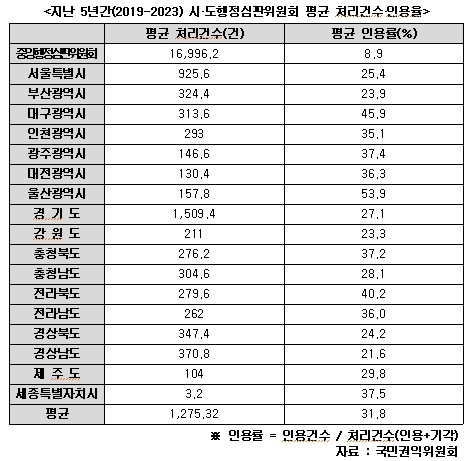 - 지난 5년간(2019-2023) 전국 17개 시·도행정심판위원회 행정심판의 평균 인용률 33.1%…중앙 행심위와 3.7배(8.9%) 차이나