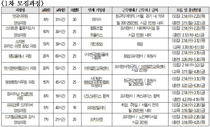 ‘4050 직무훈련’은 직업역량 강화를 통해 (재)취업할 의지가 있는 서울시 중장년(40~64세)이라면 누구나 무료로 신청이 가능하며, 과정별로 서류와 면접 전형을 통해 취업의지, 역량 등을 평가해 최종 선발한다. 1차 모집은 14일(수) 오전 9시부터 50플러스포털(50plus.or.kr)에서 ▲약국사무원 ▲스마트폰 활용지도사 ▲웨딩플래너 ▲역사문화체험강사 ▲병원행정사무원 ▲소자본 온라인 마켓 창업 ▲정리수납 컨설턴트 ▲파파크루 드라이버 ▲디지털 금융교육 강사 등 9개 과정을 모집한다.