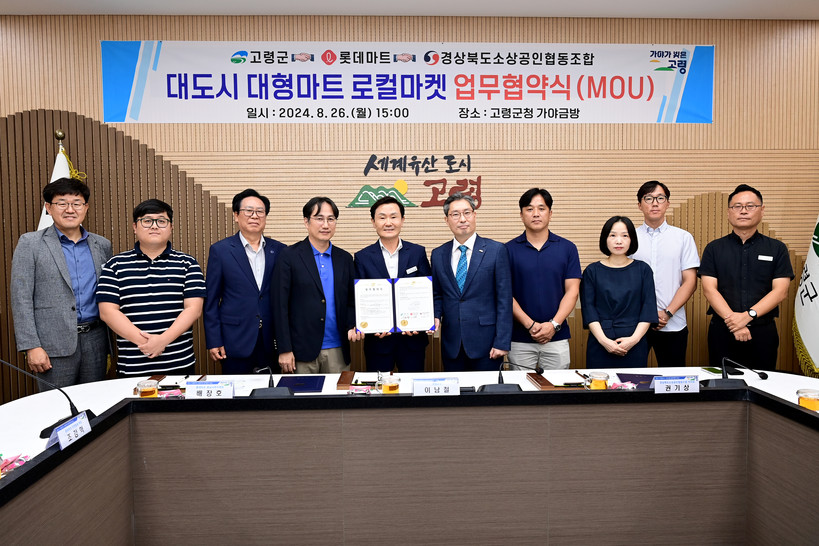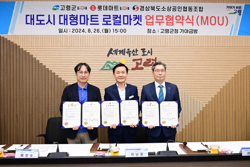 [일요주간=최부건 기자] 고령군(군수 이남철)은 8월 26일 롯데마트, 경상북도소상공인협동조합과 고령군청에서 대도시 대형마트 로컬마켓 업무협약을 체결했다고 밝혔다.