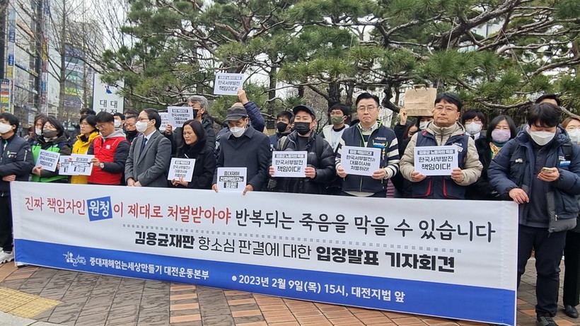 앞서 이날 태안화력발전소 청년비정규직노동자 고 김용균 산재사망 사고에 대한 책임을 묻는 항소심 판결이 열렸다. 그러나 2심 재판부는 1심판결보다도 더 후퇴한 판결을 내렸다. 원청의 책임은 조금도 인정하지 않아 한국서부발전 김 전 사장은 물론 원청도 무죄, 태안발전 본부장도 무죄 판결을 내렸다.