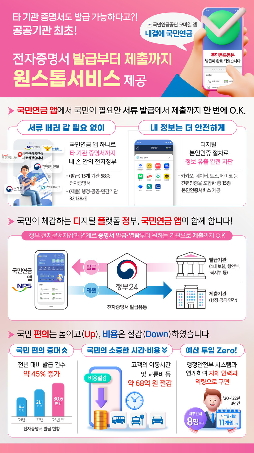 공단은 자체 모바일 앱을 통해 가입증명서 등 8종의 국민연금 증명서를 전자증명서로 유통하고, 공공기관 최초로 주민등록등·초본 등 타 기관의 50종 증명서를 발급·제출하는 서비스를 시행하였다.