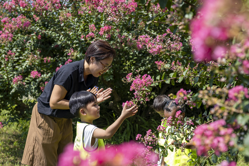 ▲ 왜관읍 동산애 어린이집 이주연 원장이 원아들과 함께 백일홍 꽃을 살펴보며 즐거운 시간을 보내고 있다.(사진=칠곡군)
