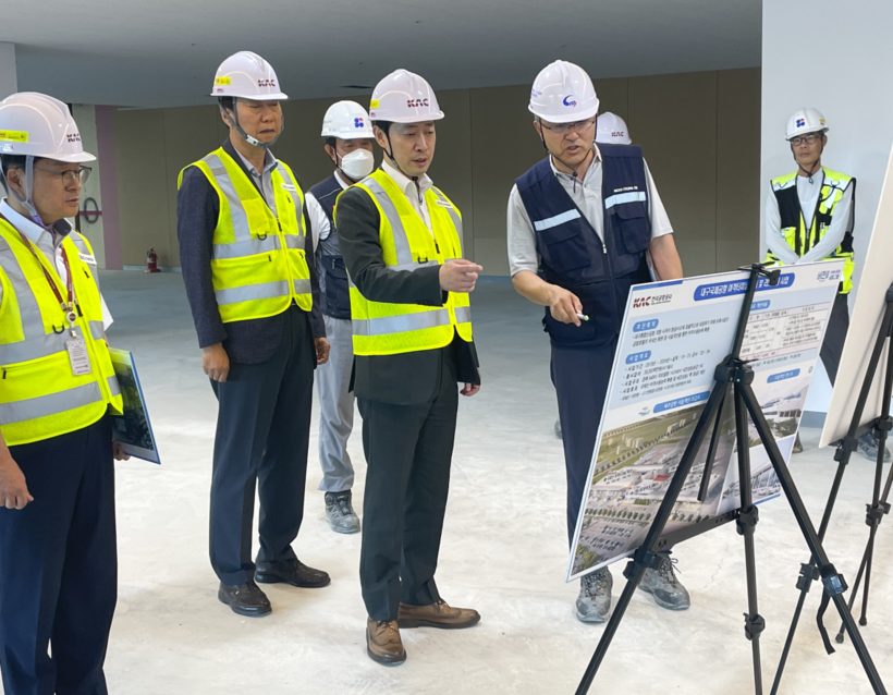 | ▲ 3일, 윤형중 한국공항공사 사장이 대구국제공항 국내선 여객터미널 공사현장을 방문해 안전관리실태를 점검하고 있다.(사진=공항공사) |