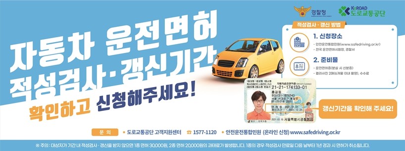 한편, 운전면허 적성검사·갱신은 전국 27개 운전면허 시험장과 가까운 경찰서, 공단 안전운전 통합민원(www.safedriving.or.kr)에서 신청할 수 있다.