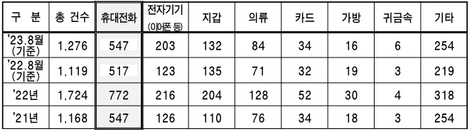 2021년과 2022년에도 휴대전화와 블루투스 이어폰 등 전자기기는 가장 빈번하게 선로에 빠지는 유실물이었다. 휴대전화는 2021년 547건(47%), 2022년 772건(45%)을 기록했으며, 블루투스 이어폰을 비롯한 전자기기는 2021년과 2022년에 각각 126건(11%), 216건(13%)이 선로유실물로 접수됐다.