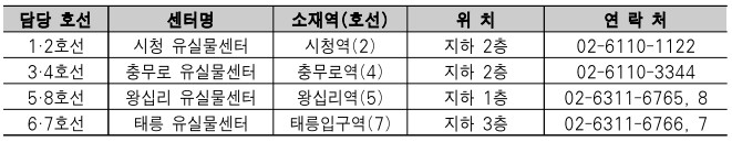 | ▲ 유실물센터 위치 및 연락처(표=서울교통공사) |