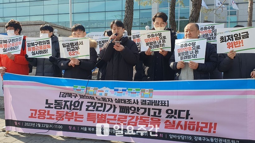 알바상담119와 강북구 노동인권 네트워크는 22일 서울 북부 고용노동지청 앞에서 기자회견을 열고 지난해 10~12월 강북구 105개 편의점에서 근무하는 노동자를 대상으로 조사한 결과를 발표했다.