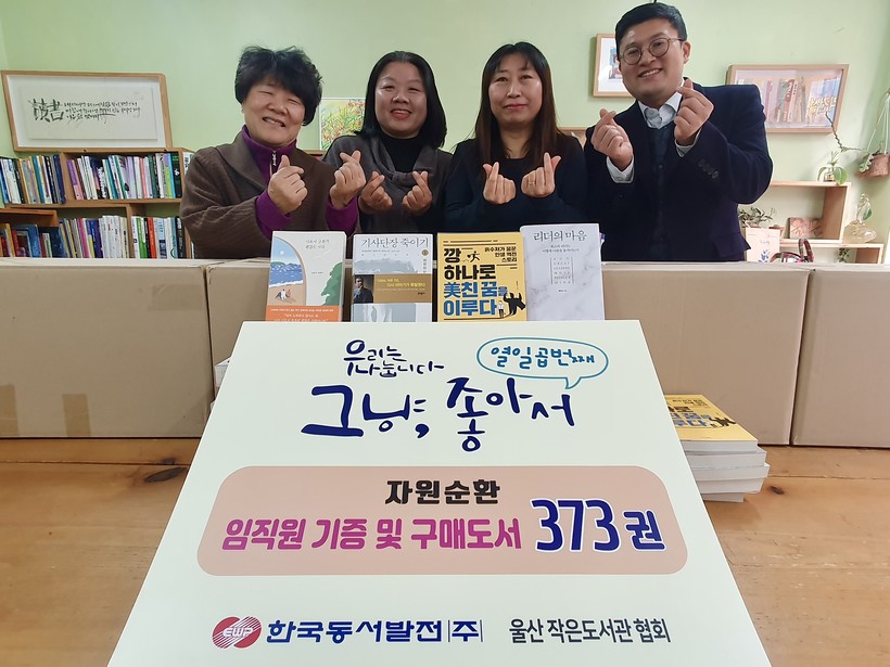 이번 나눔 도서는 울산작은도서관협회의 추천으로 규모가 협소하고 도서 지원이 필요한 꿈틀꿈틀작은도서관(중구)·마이코즈작은도서관(남구)·수자인작은도서관(북구)·명덕이음작은도서관(동구)·아너스빌작은도서관(울주군) 5개 도서관에 전달됐다.