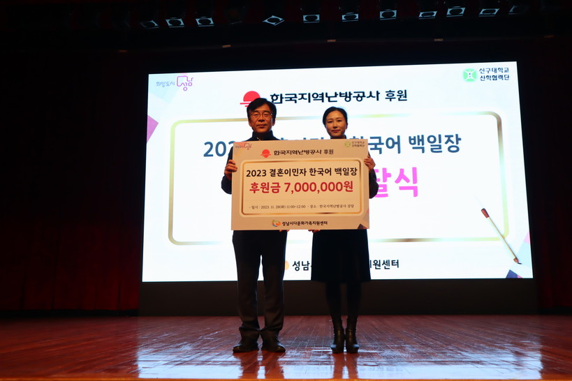 | ▲ 한국어 백일장 후원금 전달식(왼쪽부터 송현규 한난 부사장, 박서영 성남시다문화가족지원센터장) (사진=한국지역난방공사) |