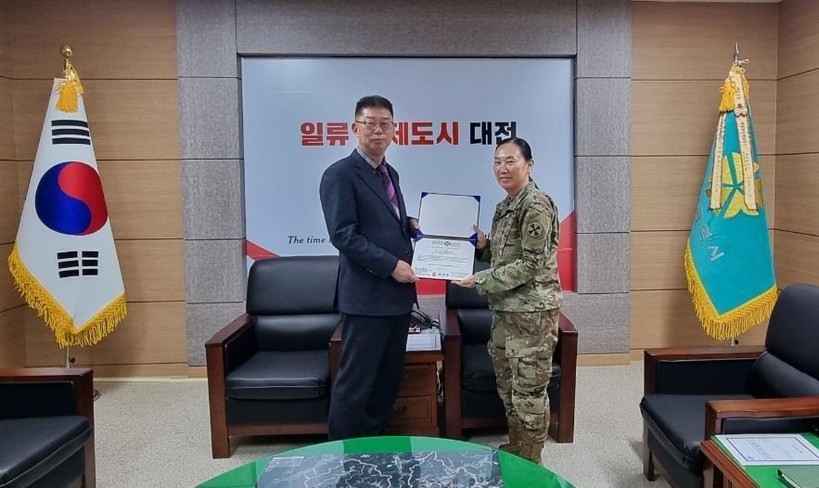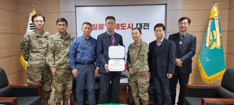 [일요주간=김영란 기자] 이장우 대전시장은 14일 윌러드 벌슨(Willard M. Burleson III) 미8군 사령관으로부터 대전지구전투 전승기념 행사의 지속적 개최에 대한 감사의 뜻을 담은 감사장을 받았다. 감사장은 임묵 대전시 시민안전실장에게 대신 전달됐다.