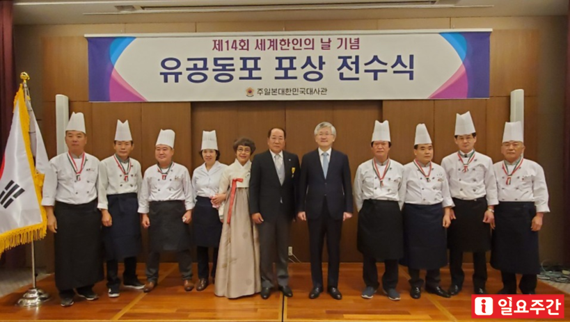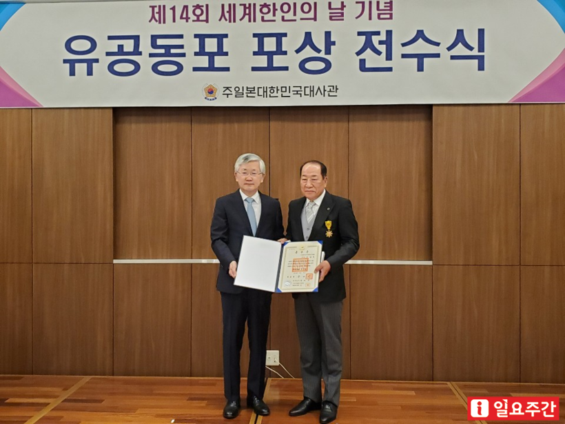 [일요주간 = 강성재 칼럼니스트] 오영석 사단법인 신주쿠한국상인연합회 초대회장이 지난 8일 한국대사관에서 열린 ‘제14회 세계 한인의 날’ 유공 동포 포상에서 ‘한일 양국의 민간 교류에 괄목할 공로로’ 국민훈장 목련장을 받았다.