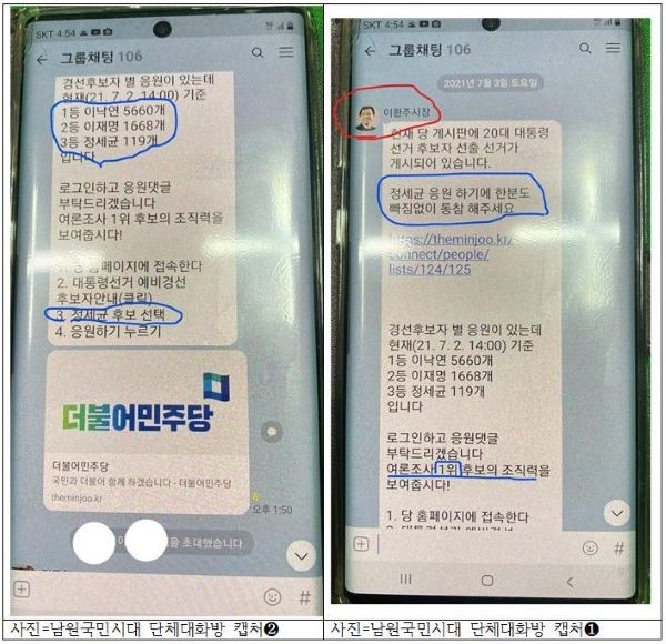 | ▲사진=이환주 시장이 정세균 지지모임인 남원국민시대 단체대화방에 올린 글(우측이 시작글) |