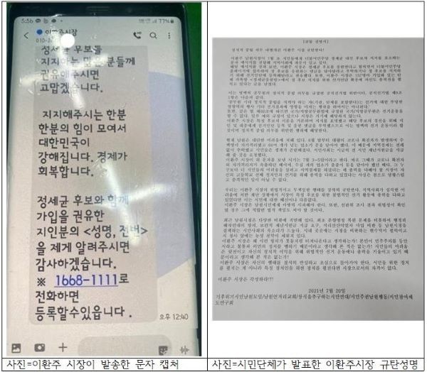 | ▲사진=왼쪽부터 이환주시장이 보낸 문자 / 시민단체가 발표한 이환주시장 규탄 성명서 |