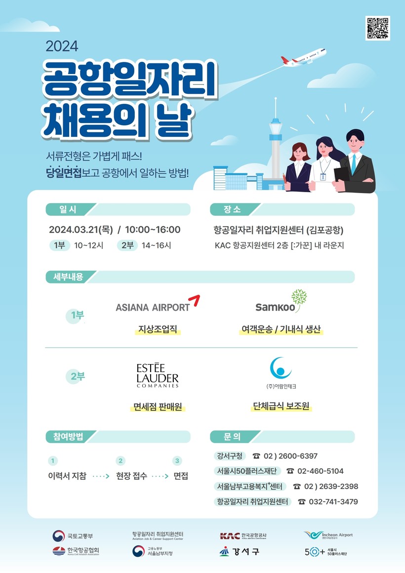 이번 행사에는 지상조업사인 ㈜아시아나 에어포트, ㈜삼구아이앤씨와 공항 상업시설인 ㈜엘코잉크 한국지점(면세점 판매원), ㈜아람인테크(급식보조) 등 총 4개 기업이 참여한다. 이들 기업은 '당일 면접·당일 채용 프로그램'을 통해 총 48명을 현장에서 채용할 계획이다.