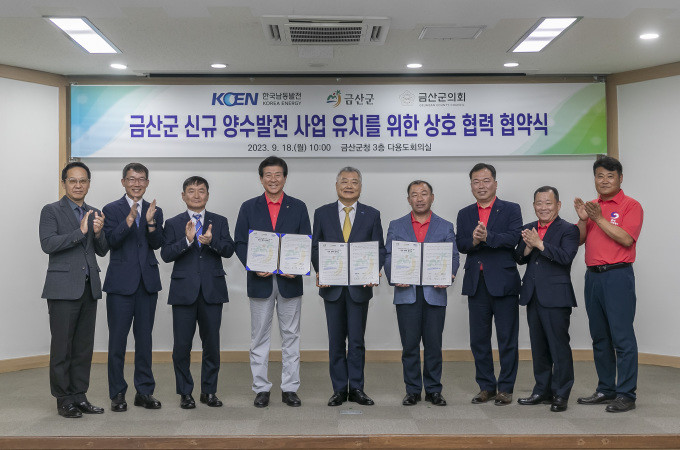 한국남동발전은 18일 오전 금산군청에서 금산군(군수 박범인), 금산군의회(의장 김기윤), 한국남동발전(사장 김회천)이 ‘신규 양수발전 사업 유치를 위한 상호 협력 협약식’을 가졌다고 밝혔다.