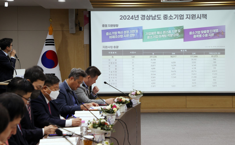 이번 간담회는 한국은행 경남본부의 ‘2024년 거시 경제전망’ 보고, 경남도의 2024년 경상남도 중소기업 지원시책 소개, 경남상공회의소협의회 등 기업단체 현장 애로사항 청취 순으로 이어졌으며 이후 도지사 주재로 지역 중소기업 지원 방안 등을 논의했다.