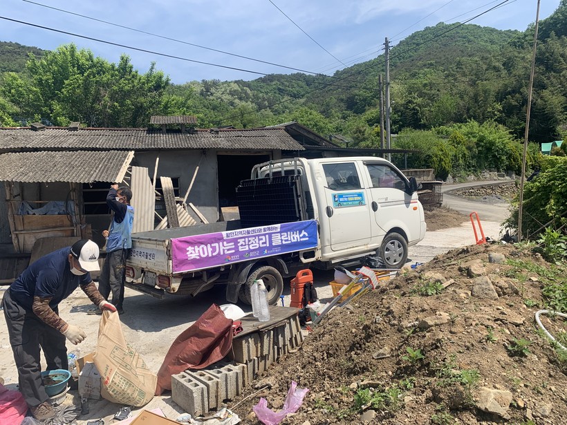 함안군 대산면 주민들은 박00어르신(독거노인) 댁에 쌓여있는 쓰레기로 인한 악취와 화재위험을 찾아가는 집정리 ‘클린버스’로 해결했다.