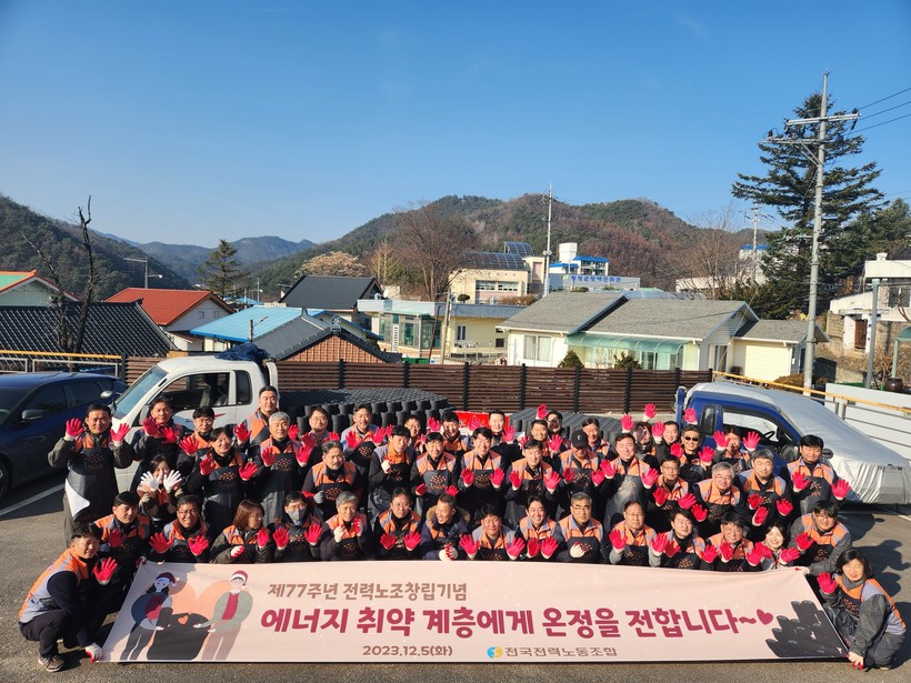 [일요주간=김영란 기자] 한국전력공사(대표이사 사장 김동철)의 전국전력노동조합(위원장 최철호)은 지난 12월 5일 강원도 횡성에서 제77차 노조창립기념일을 맞이하여 겨울철 어려움을 겪는 에너지 취약계층을 위해 연탄 6,000여장 기부하고 연탄나눔 봉사활동을 시행했다.