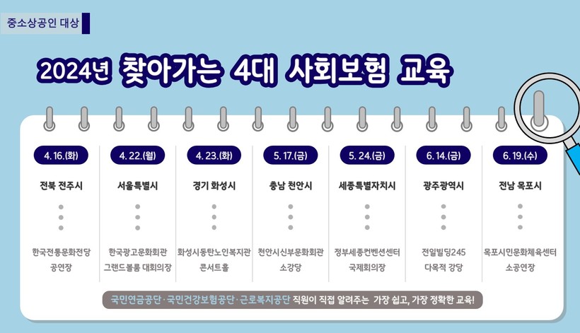 [일요주간=김영란 기자] 국민연금공단(이사장 김태현)은 4월 16일 전주시를 시작으로 6월 19일 목포시까지 7개 지역에서 중소상공인을 대상으로 ‘찾아가는 4대 사회보험 교육’을 실시한다고 밝혔다.